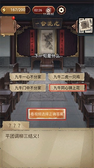 12、下一句是什么:九牛同心锦上花。当然你也可以选择【看视频选择正确答案】,也是免视频,直接跳过哟
