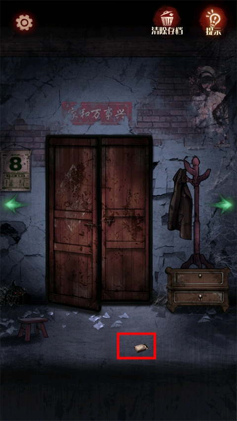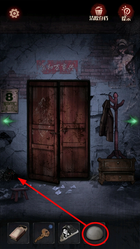 7、向右回到大门口,点击衣架下面的抽屉,使用【暗红钥匙】打开,获得【馒头】。
