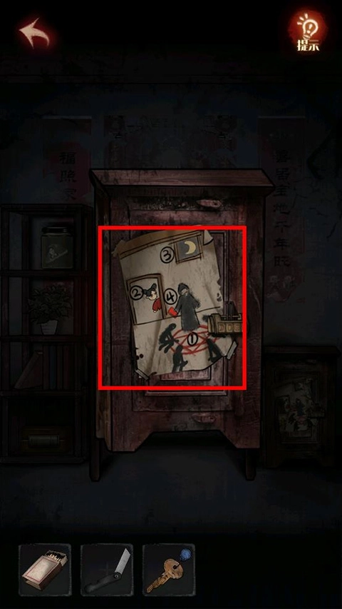 4、查看纸人下面的柜子,记住上面的图案:1阵图,2小女孩,3月亮,4书,根据这些线索打开上面的锁,获得【旧衣服】和【暗红钥匙】。