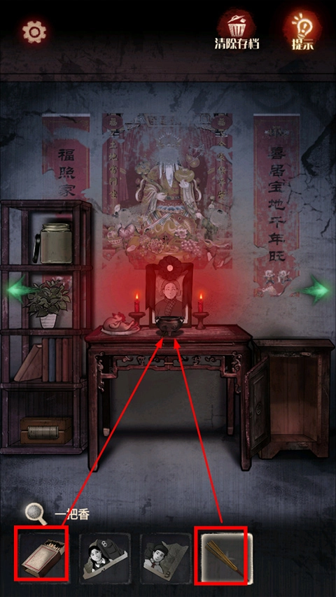 1、向右来到灵位处,将【一把香】插入香炉,使用【火柴】点燃,在燃烧的烟雾中看到数字:583。