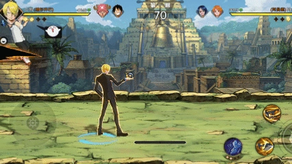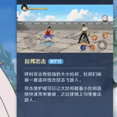 在解析技能之前稍微说一下航海王壮志雄心跟火影忍者不同的地方,对于技能的定义是上面图标一技能,下面图标二技能,所以在解析航海王壮志雄心的时候我也会按照的定位来解析。佐罗的一技能是一个快速突进的效果,长按会有更高的伤害,但会消耗更多的精力值。二技能有两段效果,你可以理解为是普攻后两段的强化版,第一段起跳旋转攻击,第二段地面旋转攻击,其中第一段可以闪避飞行道具。