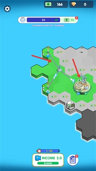 2、完成建筑订单后,将新解锁的区域与已有区域进行连接,可获得对应金币收益,同时积累建筑进度。