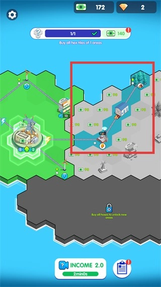 3、当金币资源充足时,点击地图中待解锁的区域,消耗指定数量的金币购买该区域,扩展地图的可操作范围。