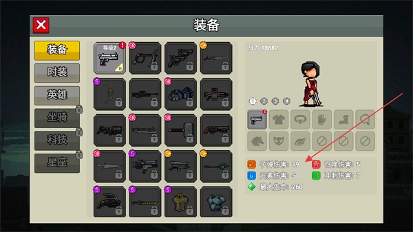 1、在装备界面里可以查看各类装备,选择对应的装备后,能提升角色的子弹伤害等属性,为后续战斗提供助力。
