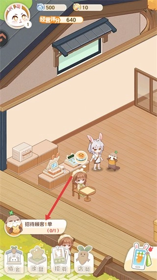 1、进入店铺主界面后,找到显示“招待顾客1单”的提示区域,点击该区域对应的操作位置,即可启动顾客订单流程。