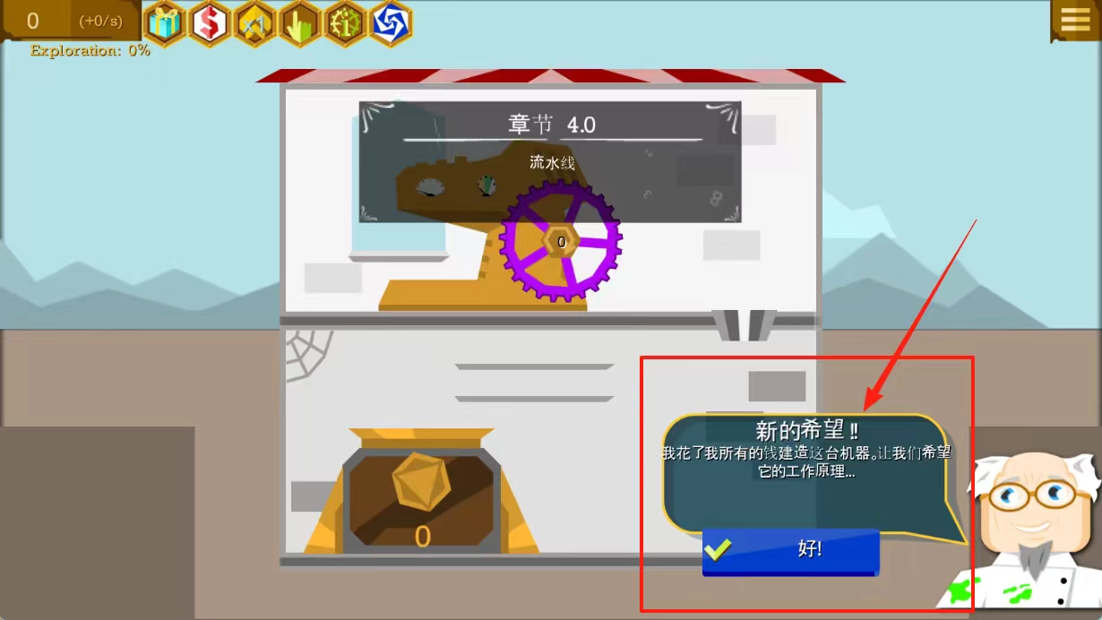 2、聆听戴眼镜老爷爷对机器的介绍,点击 好确认后,熟悉游戏核心机制与工厂运营的基础逻辑。