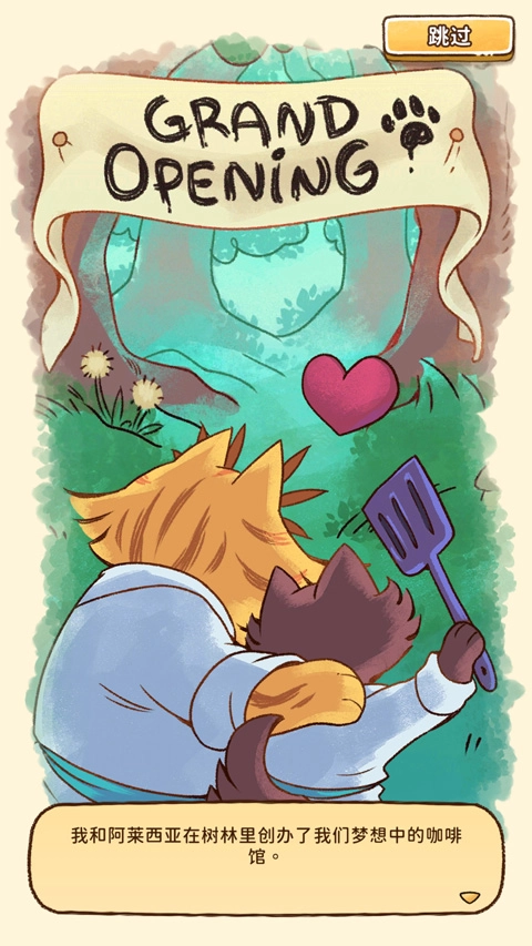 1、开启营火猫咖啡馆,游戏启动前会播放一段介绍游戏背景的动画,点击右上角即可跳过;
