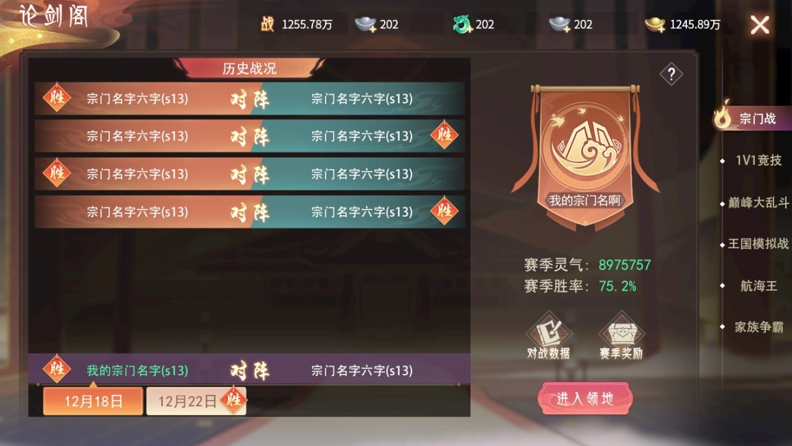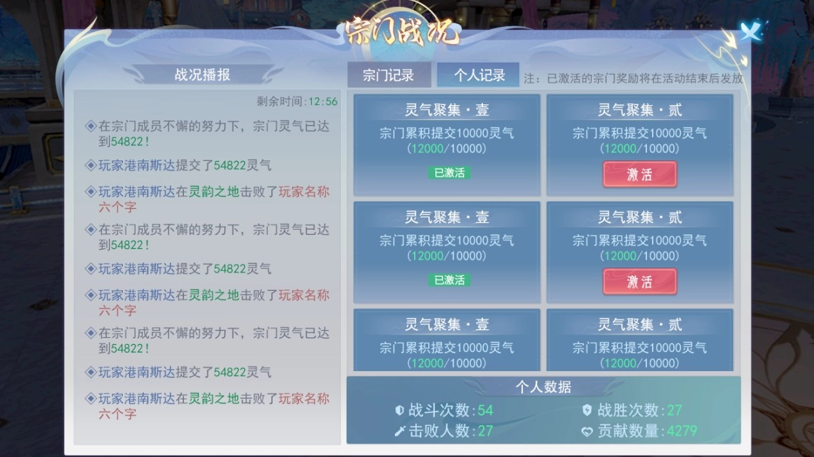 (3)系统描述:宗门战是以宗门为单位参加的跨服玩法,跨服开启后,角色达到指定等级且加入宗门后即可参加。每场宗门战分为两个阶段:【灵气争夺战】和【先锋车轮战】。玩法内各种行为可获得灵气,活动结束后总灵气较高的一方获得本次宗门战的胜利。