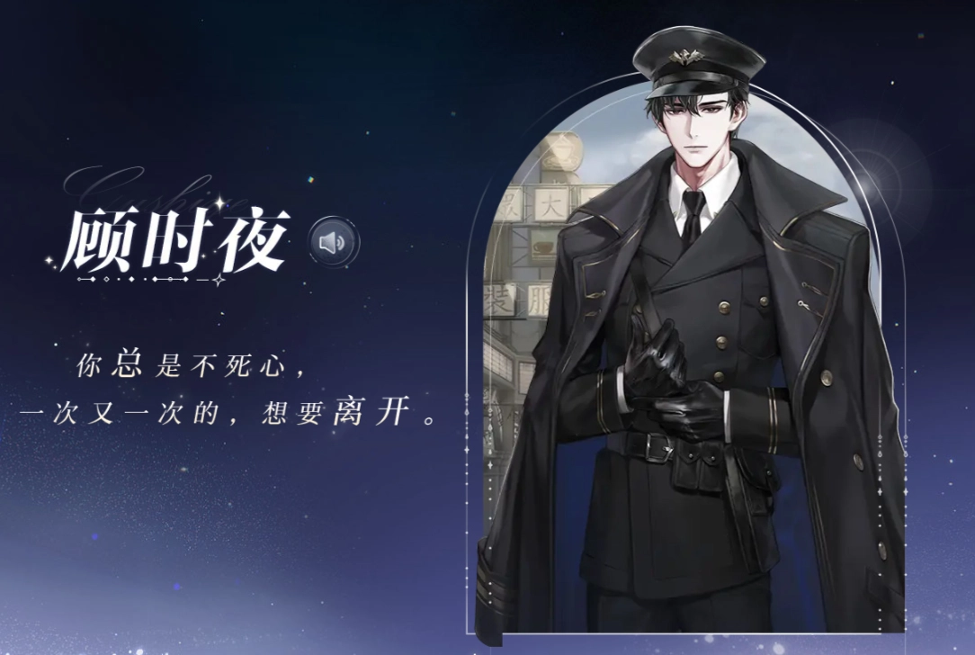顾时夜是世界之外四大男主之一,还不清楚游戏公测时会不会换,他是一位风度翩翩的商人,他的聪明才智和商业头脑为他赢得了无数的财富。他对女主角产生了好感,并且在游戏中扮演了一位坚定的支持者和保护者。