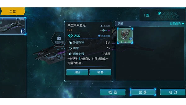 电池相当于舰船的护盾,装备更高级更多的电池可以提高舰船的血量(在PVE中会自动给每艘船装满电池)
