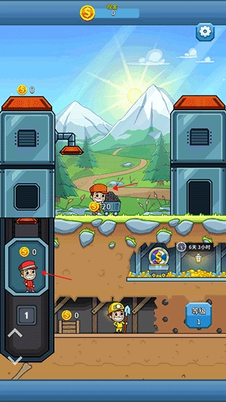 1、首先根据新手指引点击地下矿中的穿黄色衣服的矿工,然后他会进行挖矿,挖好矿后会背到左边靠近电梯的小箱子里面,这时点击在电梯中的红色衣服矿工,他会把箱子里面的东西传送到上方机器里面,然后点击在地面推小车的红衣服矿工,他会推着小车到机器下面接金币,送到原地。这三个矿工的规律性比较强,下面黄色的矿工可以一直进行挖矿,然后电梯里的矿工只需要吧挖好的矿石进行往上运送即可,地面上的工人,在机器下接住矿石推回原地就可以获取金币。