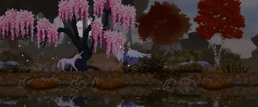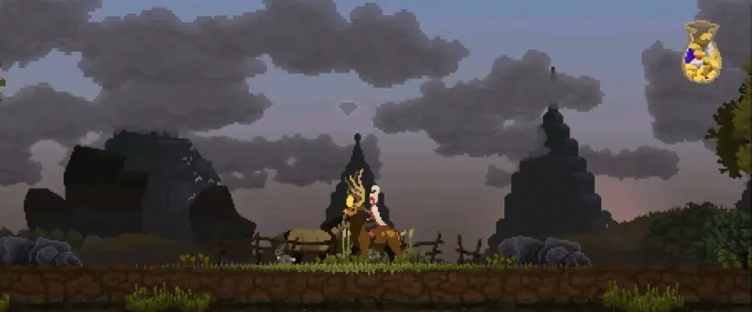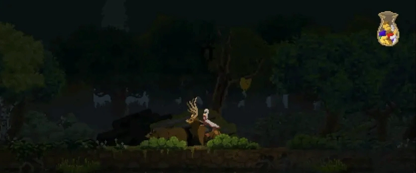 可能有部分玩家对游戏的第一印象算不上有多好,即便是放在像素游戏当中比较,《王国:两位君主》中的角色形象和场景建筑只能只能称得上粗糙,缺乏辨识度,很难让玩家上来就对这个骑着马的糟老头产生“这是主角”的认同感。但当游戏画面开始运动时,便能直观地看到游戏在动态效果上的过人表达,卷轴式画面流动得十分顺畅,树丛随风摇曳,雄鹿从中跃出,波光粼粼的湖面上倒映着光与影,由近及远的透视关系给了玩家“遥远”的视觉感受,更像是活起来的一幅画中世界。