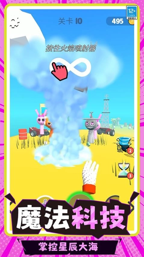 使用魔法能量的时候可让对手的形状发生改变,还可直接将他们举到空中。