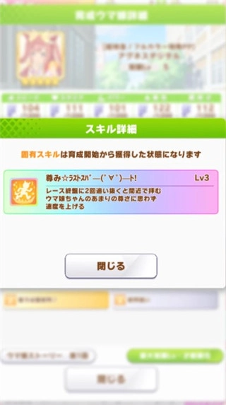 4、相比较之下,第二种方法因子继承要明显比第一个方法稳定实用,且综合收益更高。我们首先需要通过万圣节支援卡或者用川上公主来培育马娘并让她学习永不停歇的少女技能。这样在培育结束后,该马娘就有机会得到该技能的白色因子,接下来我们选择她作为种马就能够将技能继承给下一位我们需要的马娘角色了。