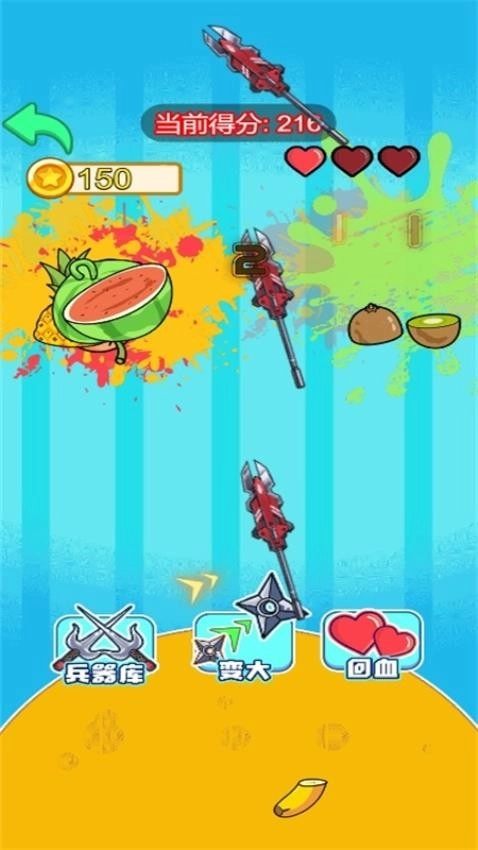 4、水果切开特效完美呈现,观察特效动画就能带来不错的视觉效果,还能收获到丰富的资源金币购买更多武器。