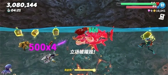 3、建议使用送的狂暴鲨群刷钱,否则最右侧的洞穴会进不去,且攒下来的钱经量不要乱花,钻石优先买火箭包,金币优先攒起来解锁顶级鲨鱼。