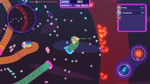 2、超好玩、超刺激、可与全球2265玩家实时对战、真人联网版的贪吃蛇游戏。在蛇蛇争霸手机版你扮演的是一条小蛇,迟到不同光彩的食物从而变长,在变长的过程中你的头部不能碰到其他任何的竞争对手,但是身体无所谓,这是你的武器。蛇蛇争霸手机版你可以使用你的武器去彭撞其他的竞争对手,从而消灭他们。