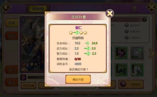 升星武将需要消耗同等武将的将魂,1-5星需要的将魂数量依次提升。升星只能用相同武将的将魂。升星对武将没有等级要求。