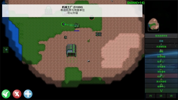游戏最重要的是资金,我们现在只有少的可怜的资金,怎么办呢?当然是找一个黑漆漆的大坑,然后让建造车在上面建‘’资金提取器”,钱就开始源源而来了,可升级,建议初期就升。