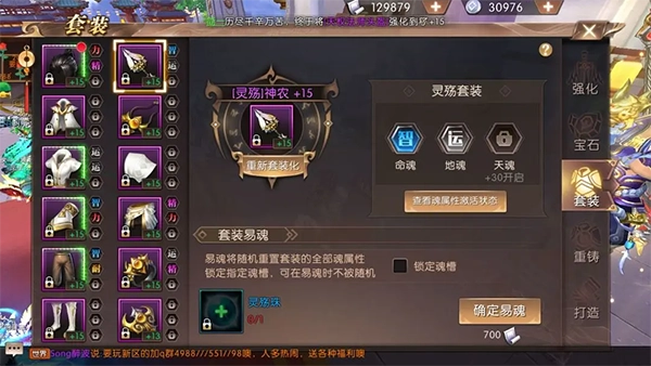 前期推荐天玄套装、灵殇套装,50级以后会重新更换新的套装;套装碎片合成进行套装化;珠子进行套装魂属性改变;当套装内的装备魂属性相同时我们的天命者背后出现光圈特效(光圈特效根据魂属性改变)