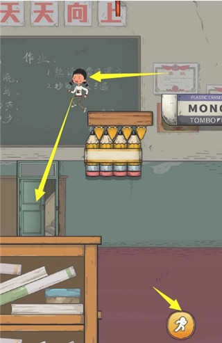 关卡1:首先点击红色绳子,待尺子掉落之后,迅速点击右下角的奔跑按钮即可。