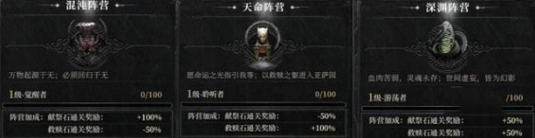 玩家们刚进游戏的时候会出现三个职业,你们需要选择一个职业作为初始角色,当选择好了后就可以进入战斗了,一开始的战斗很简单,基本上按照流程就可以轻松过关,玩家们在完成教程后,会出现三个组织,分别是混沌、天命、深渊,每个组织都有独特的加成,当加入了混沌组织后,玩家们每次完成挑战都可以获得百分之百的献祭石、救赎石则减少百分之五十,当加入了天命组织后,玩家们每次完成挑战都可以减少百分之五十的献祭石、增加百分之百的救赎石,当加入了深渊组织后,玩家们每次完成挑战都可以获得百分之五十的献祭石和百分之五十的救赎石。