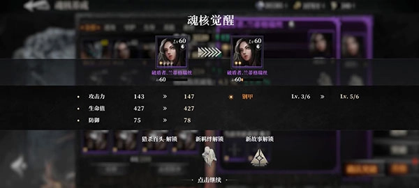 魂核品质达到特定星级后消耗规定品质的同名魂核后可进行觉醒,觉醒可提升魂核属性数值、魂核等级上限,每达到特定星级后可解锁对应魂技及羁绊点;