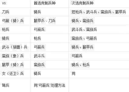 从上表不难看出:某些兵种几乎可以完克(命中率≥90%)另一兵种:比如藤甲兵完克弓箭兵;刀兵完克弩兵。上表仅为理论数值,然而在实战之中,我们所能得到的结论远远不止这些。比如从表中你可能会猜想:怎么没有完全能压制枪兵的兵种?弓箭兵有什么用,他几乎被所有兵种压制?这正是游戏的奥秘所在,因为弓箭兵完克枪兵,如果微操到位,甚至可以在400vs400的战场上,一兵不死 ,全歼敌兵。