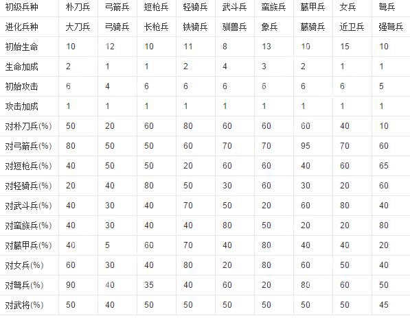 三代的三国群英传中,士兵的作用非常突出(一个武力只有30的文官如果用兵得当,完全可以擒获携带相同数量士兵的诸如吕布、赵云这样的猛将,甚至可以以寡敌众),但并非带的兵越多就一定越强。兵种相克原理是基于某一类型的士兵对另一类型的士兵的平均攻击命中率的基础上产生的:如果A类型士兵对B类型士兵的平均命中率为M%,那么B类型士兵对A类型士兵的平均命中率为1-M%,根据这个原理参照下表的数据,就可以得出结论。