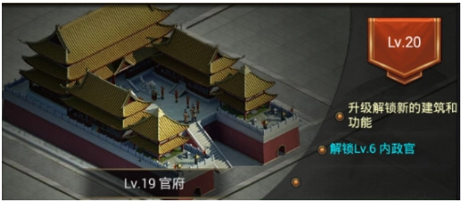 官府在地图上的外观会随着官府等级有所改变,所以想要气派一点当然要赶紧升级!!当然,这不会是主因,而是其他建筑的升级都会被官府卡上限,游戏中玩家等级每5级可以升一次,意思是角色20级可以升官府Lv.4,另外升级官府可以解锁一些功能,例如内政官、铁匠、研究员等;所以只要可以升级官府记得马上丢下其余建筑,升级就对了。