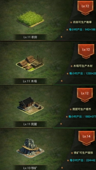 共有12个建筑物需要升级建造,建议的升级顺序是:官府→太学院→仓库→城墙→步兵营、骑兵营、弓兵营→铁矿、农田→民居→木场→商店。以下就来解释为何需要这样的顺序?