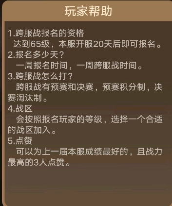 1.跨服战报名的资格达到65级,本服开服20天后即可报名。