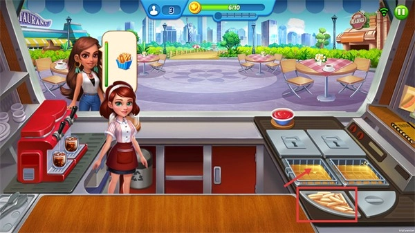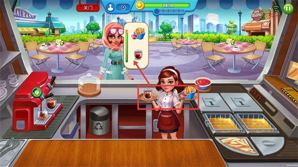 3、准备好【薯条】与【饮料】的餐品后,将其配送给顾客完成订单,可积累【金币】进度,进而推进关卡的流程。