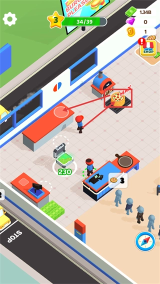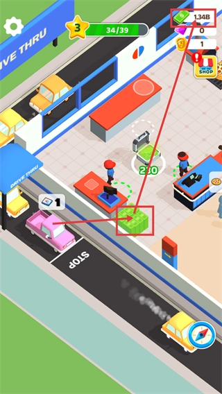 4、领取场景内的金币堆资源,增加当前【1.34B】的资金储备,为后续店铺升级做准备。