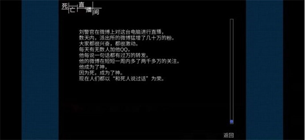 1、《死亡直播间》是一部自制的文字冒险作品,游戏以文字内容为核心呈现形式。 2、该游戏的画面风格较为新颖,玩家能在游戏过程中体验到丰富多样的感受。