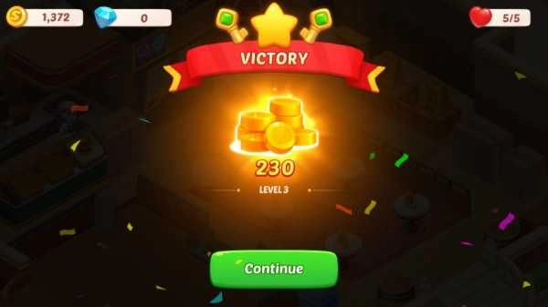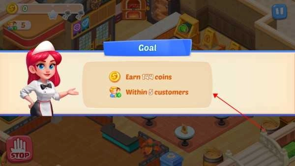 2、每个关卡都有不同的目标,例如有的关卡需要服务五位客人,并赚取144金币才能获得满星评价。