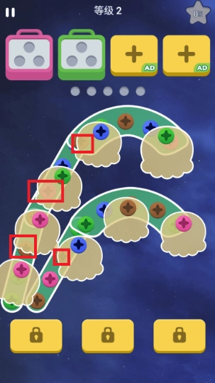 1、打开游戏进入页面后,通过匹配相同颜色的螺丝与盒子来完成消除操作。