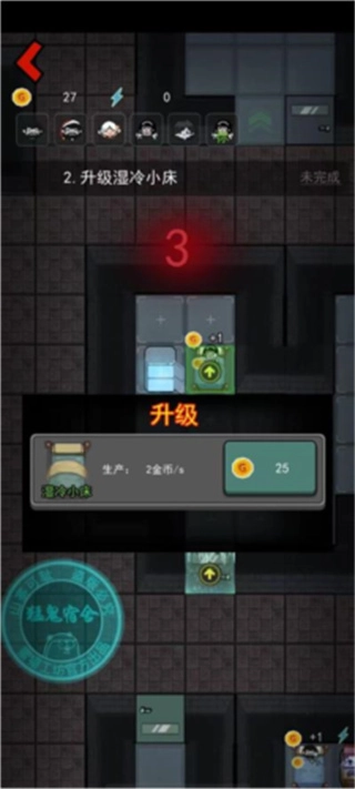 4、接下来要在倒计时结束前找到空房间睡觉,在此期间会得到金币,用于建造和升级防御设施;