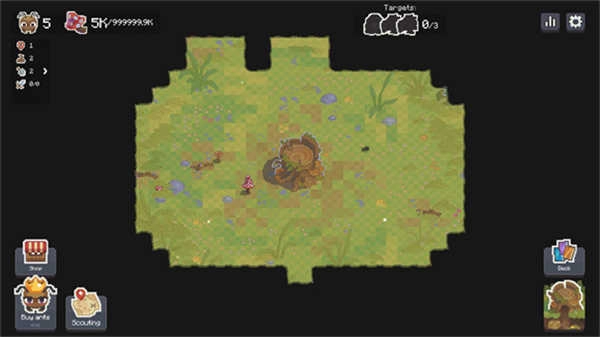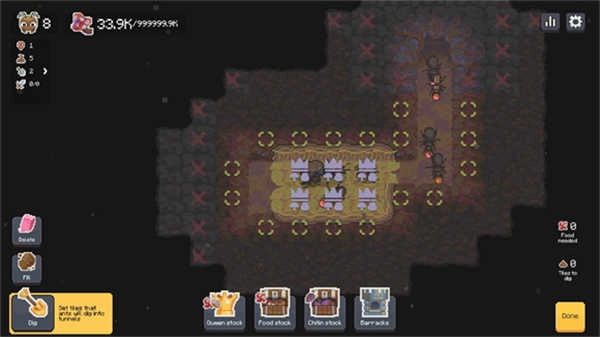 -游戏开始后,左上角显示的是蚂蚁数量与食物储备。你可以通过点击右下角的“树桩”进入你的蚁穴,查看和管理你的蚁群和资源。