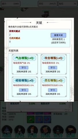 4、行囊是背包,所有收集的材料和装备都会装在这里;装备是刷怪推图获得的装备,可以进行穿戴和洗炼、精炼,没用的装备可以直接分解;天赋可以通过消耗指定材料获得更多天赋,也可以重置天赋。