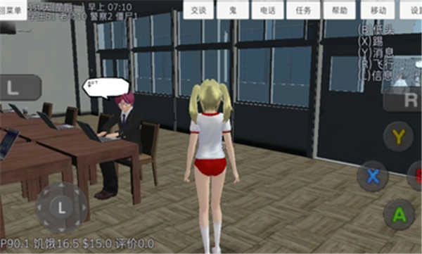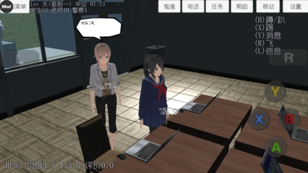 玩法:很普通的玩法,无僵尸模式,照着课表上课,吃东西,上社团活动,加入或退出社团,和学生老师互动,攻略学生并和学生恋爱,爬山玩水,開車,等...... .。