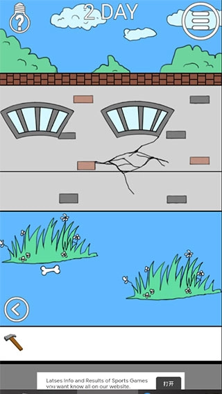 3、点击屏幕右下角的按钮来到右侧区域,按住锤子拖到有裂纹的墙壁上,就可以砸出一个洞。