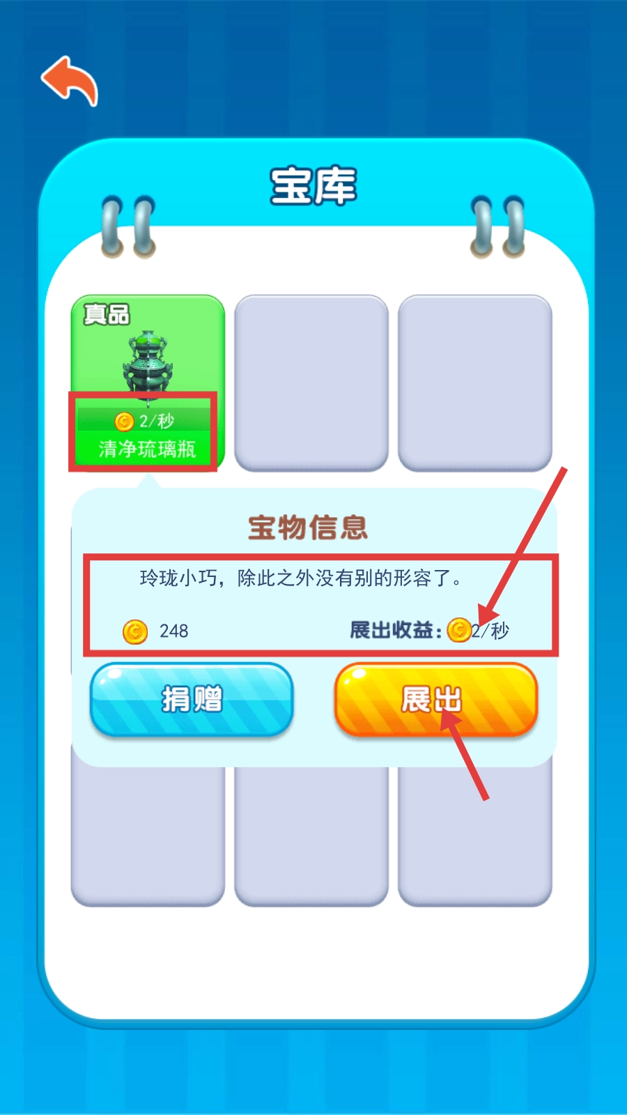 2、在宝库内,对【清净琉璃瓶】等宝物点击【展出】,该宝物玲珑小巧,展出后可获得【2/秒】的金币收益,稳定积累资源。