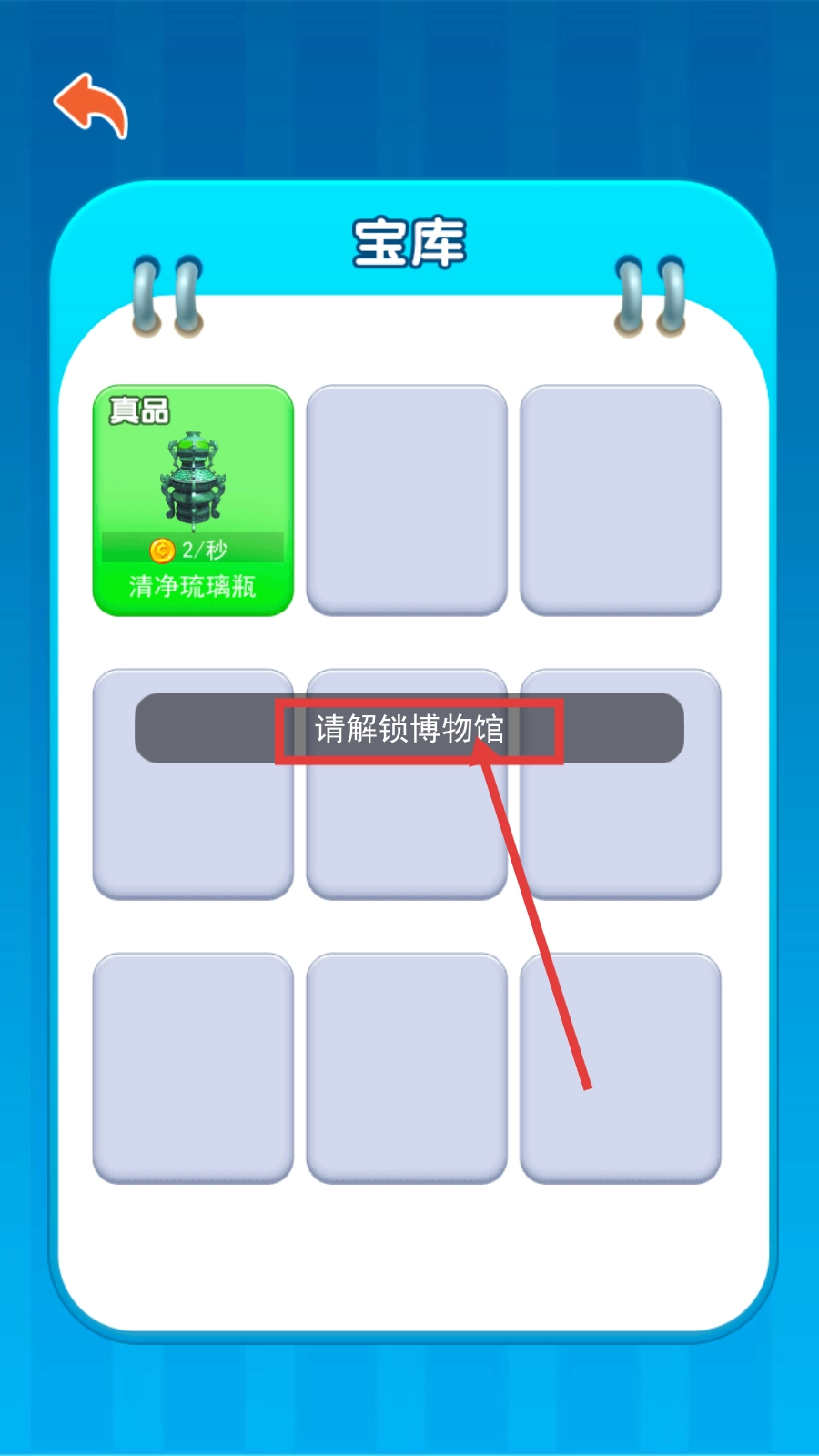 3、当出现【请解锁博物馆】提示时,需通过挖矿、宝物展出等方式积累金币,目标为博物馆所需的【199金币】,推进解锁进度。