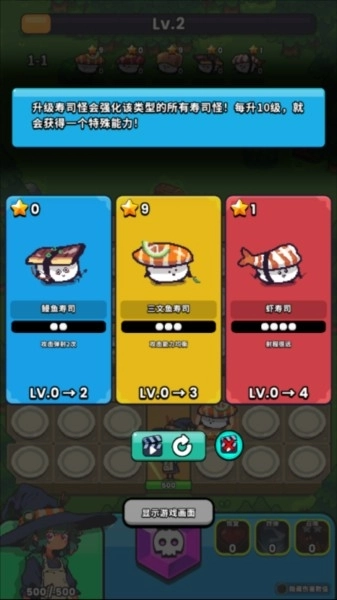 3、而且不让怪物突破防线,能拿到三星评价,获得的奖励可用于购买新的寿司。