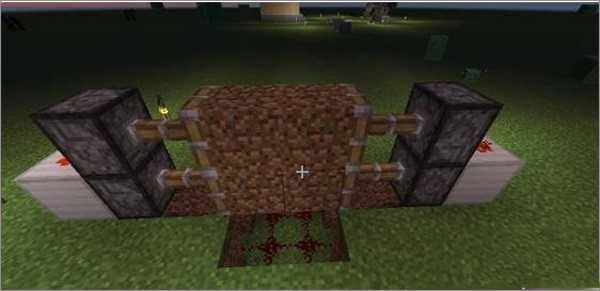 4、首先需要挖一个坑,按照下图摆好相应的红石、固体方块和红石火把。