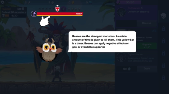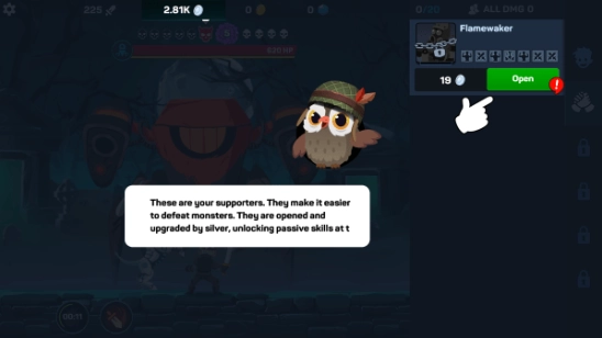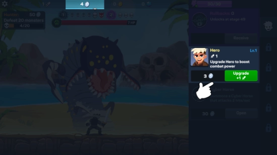 3、粉碎怪物,雇佣和升级新英雄以解锁新的闲置能力。