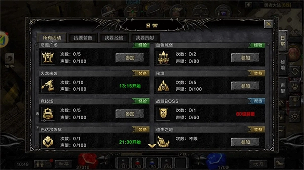 2、日常活动: 每日参与恶魔广场、血色城堡、竞技场和赤色战场等,这些活动在特定时间开放,提供丰富经验和奖励。