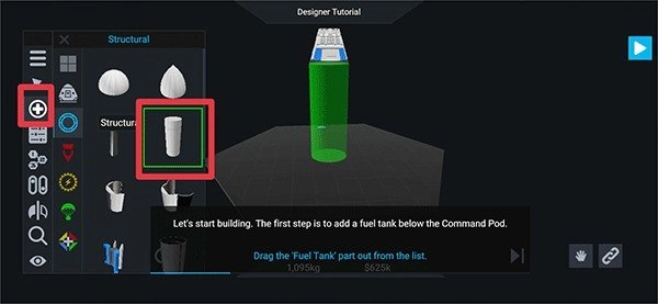 3.进入后,根据提示,在指挥舱下方添加一个燃料箱。点击加号按钮,从“structural”分类中选择合适的部件