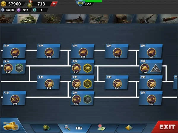 大家可以通过升级科技提高单位战斗力(有时比上将领还厉害),升级科技需要材料而材料就是左上角除显示713勋章以外的所有。主要从剧情 征服 氪金 统治任务中获得。
